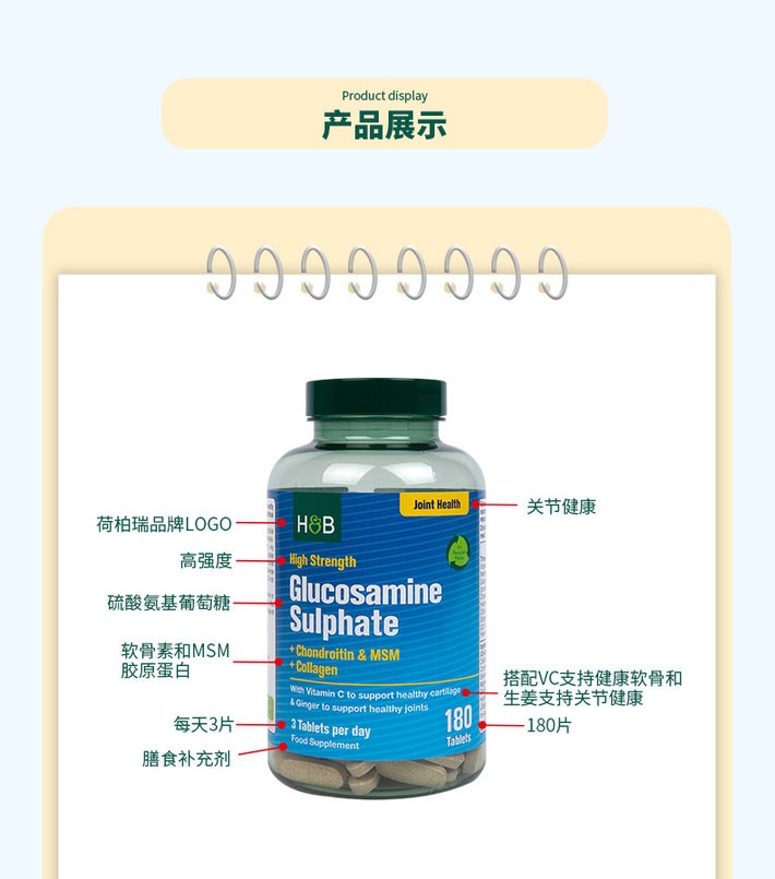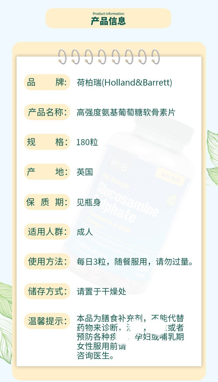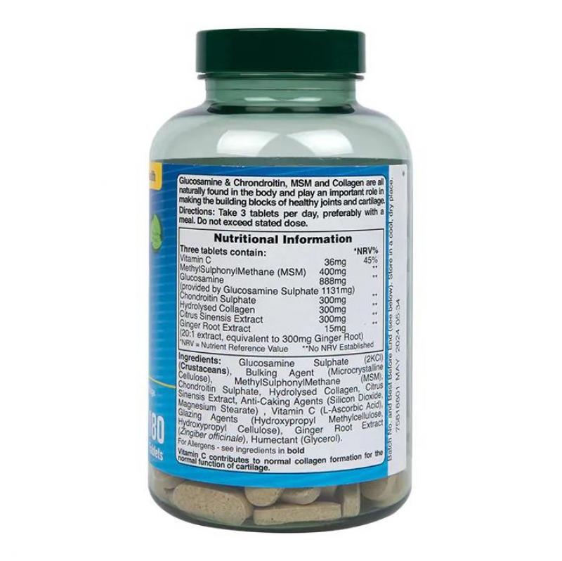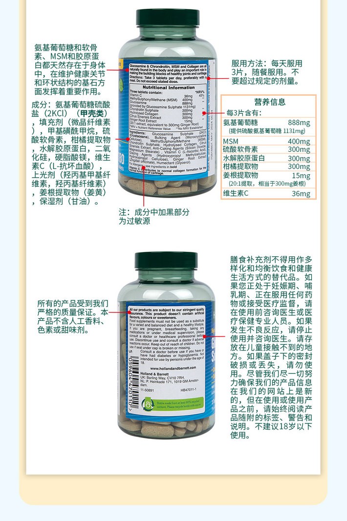 【瓶盖略磨属良品 介意勿拍】英国荷柏瑞(HOLLAND&BARRETT)三倍氨糖软骨素180片