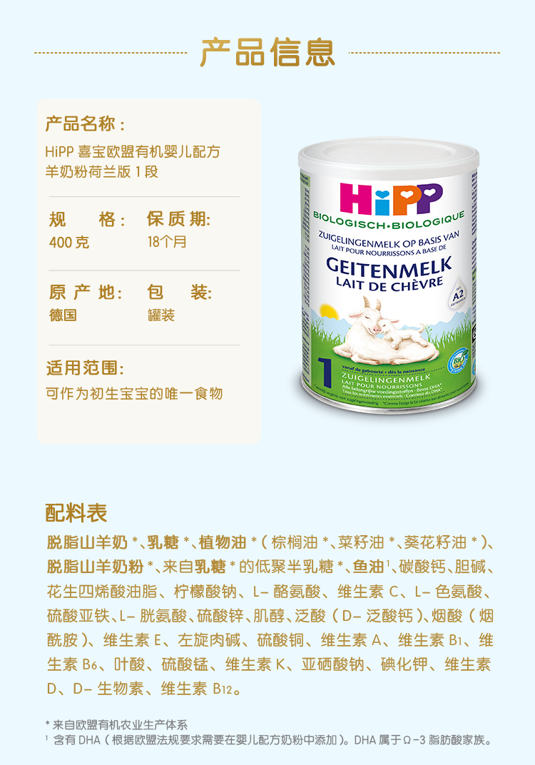 HIPP荷兰喜宝A2-β酪蛋白有机羊奶粉1段 400g