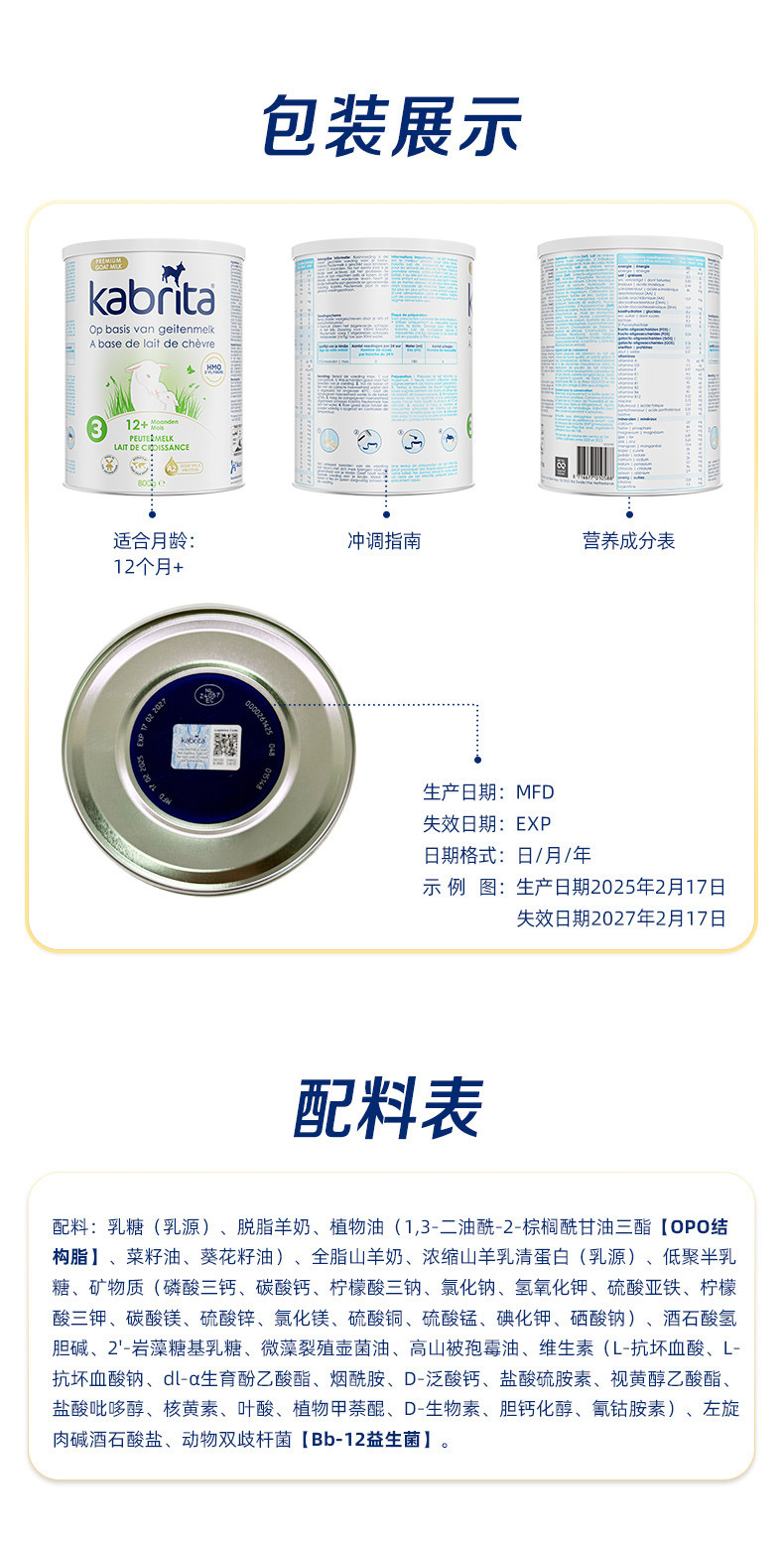 荷兰版 Kabrita佳贝艾特婴幼儿羊奶粉白金版3段1岁以上 800g/罐