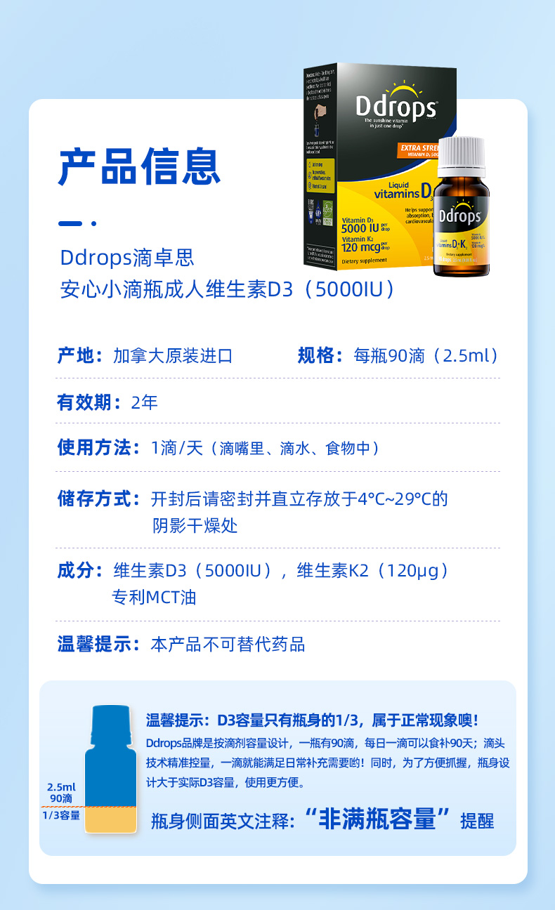 【品牌直供+防伪码】Ddrops滴卓思 成人维生素D3 5000IU+K2 滴剂 90滴