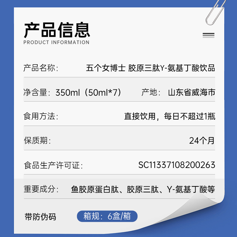 国内发货 FIVE 五个女博士 胶原三肽γ-氨基丁酸饮品 350ml(50ml*7)