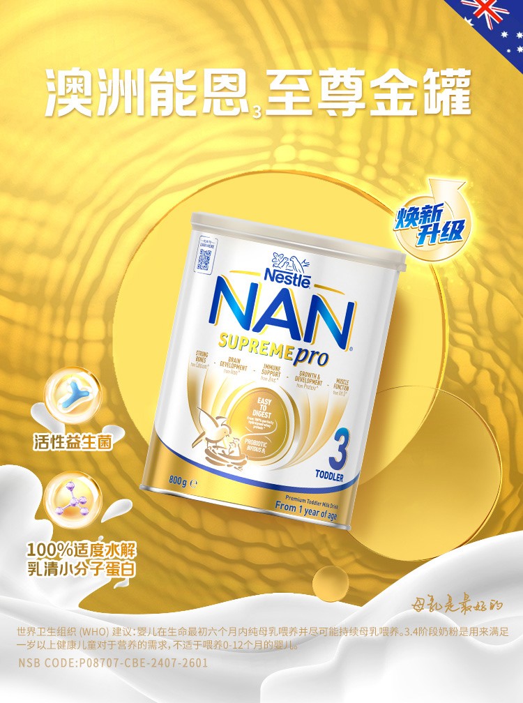 【品牌直供】雀巢澳版超级能恩3段适度水解益生菌低敏防护婴幼儿奶粉800g(适合1岁以上)