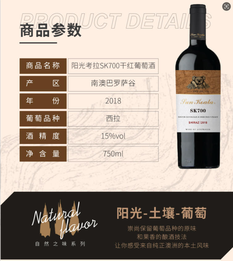 澳洲原瓶原装 阳光考拉SK700干红红酒750ml