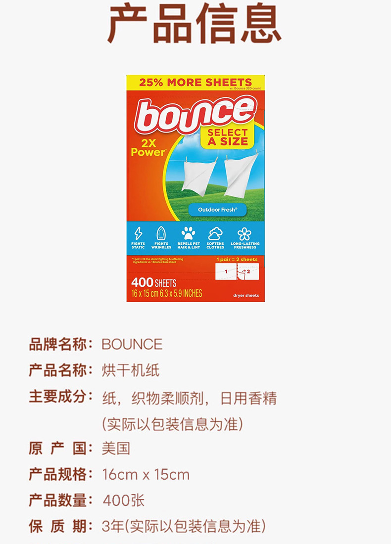 美国Bounce邦氏柔顺抗静电香衣纸烘干机用400张/盒